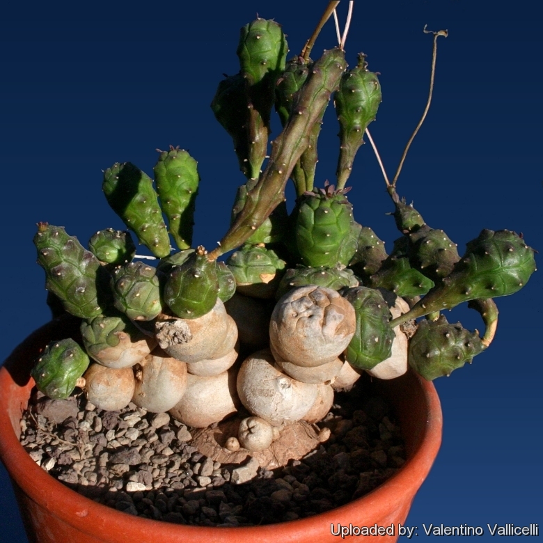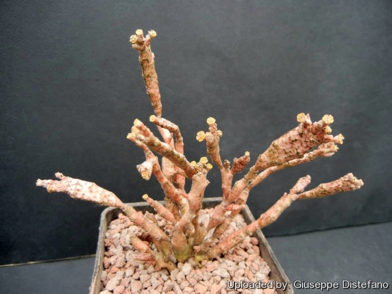specimen: Euphorbia tulearensis. Native to Madagascar. Grows on rocky limestone cliffs. An adorable little succulent plant that develops a wooden tuberous caudex with a crown of short to elongate fat branches. It is one of the rarest of the Madagascan euphorbias and not common in cultivation. It eventually becomes a small shrubby bonsai-like bush. The Euphorbia tulearensis growth form illustrates the typical horizontal habit of most Madagascan euphorbias. more info, more info.