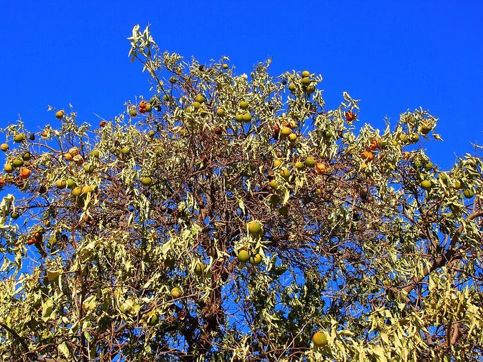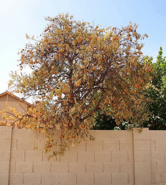 I fear the days of citrus growing in Phoenix are nearing an end. Gone will be the days of watering these water-intensive trees to one’s heart’s content, for no amount of watering will save them. The time has come to let them go. Indeed, it may be time for Phoenix to act like the desert it always was and stop pretending it can sustain such tropical vegetation.