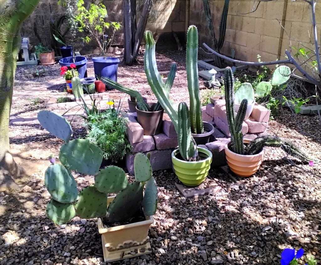 Here’s a quick pic of some cacti growing in pots. Notice the darker green sections indicating new growth.