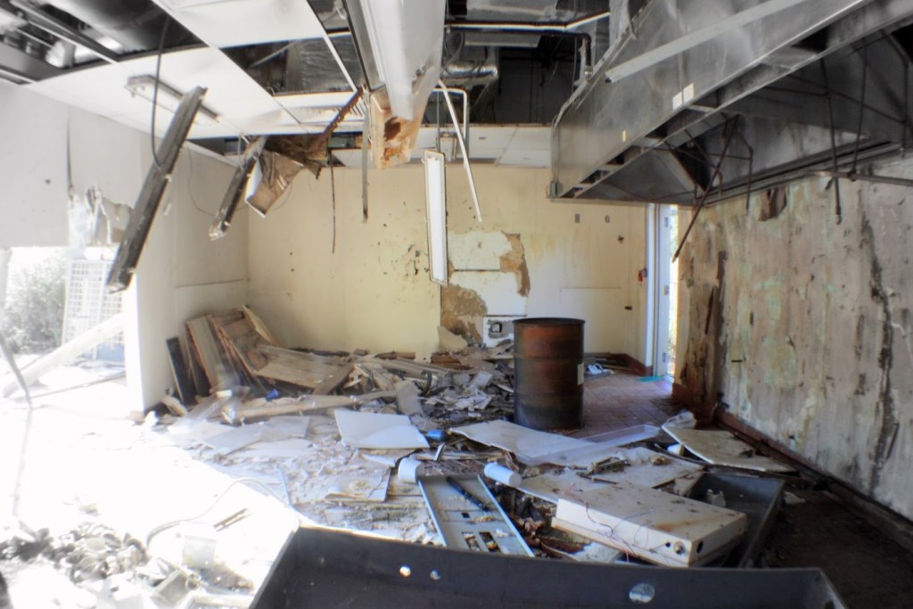 We visited the abandoned park in early February 2009. The park had been closed for five years and local kids were using it as a skate park. Most of the structures were damaged and all the office buildings were trashed.